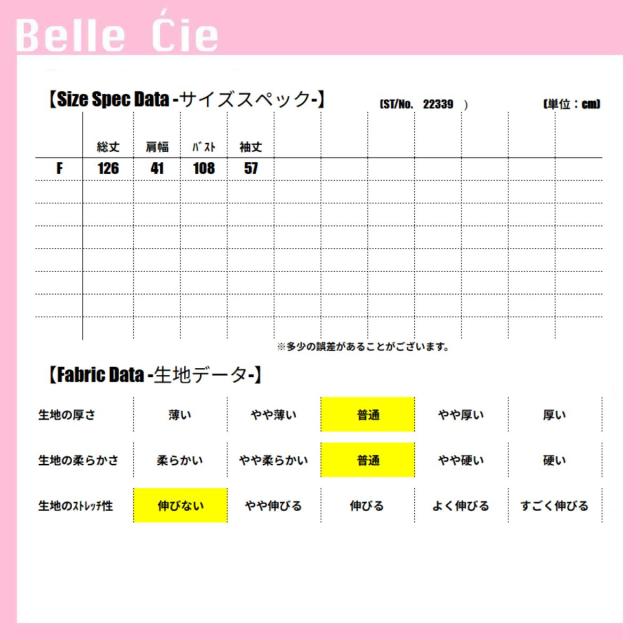 【F】:総丈126 肩幅41 バスト108 袖丈57