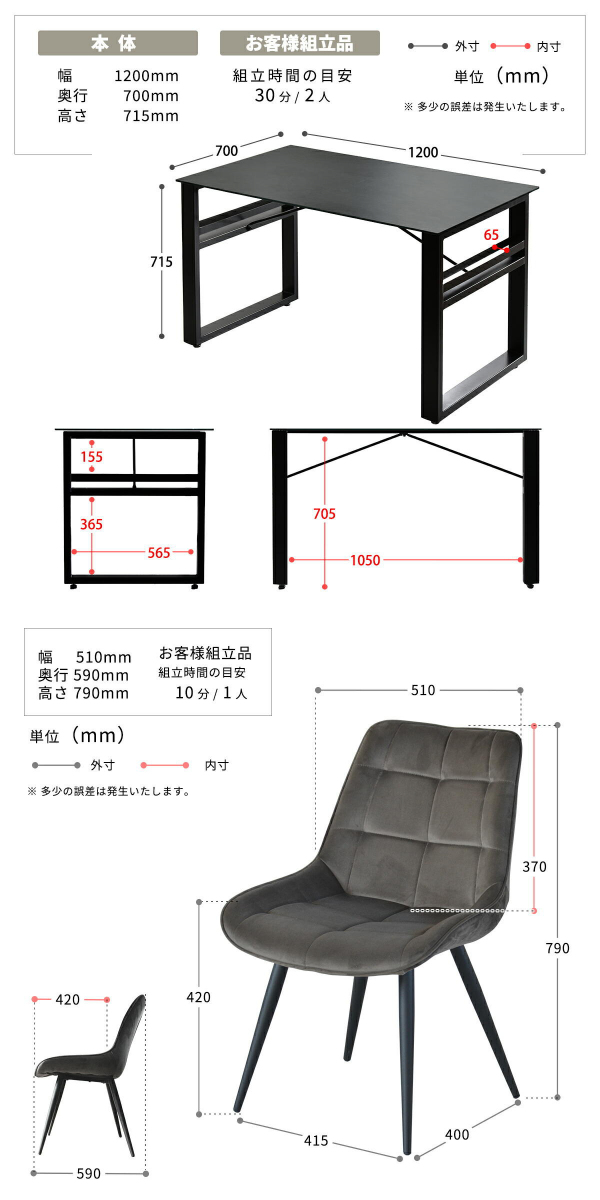 | 耐荷重 | テーブル:約40kg チェア:約80kg |