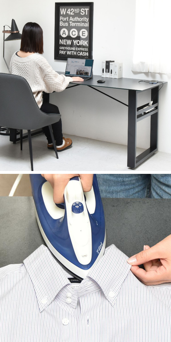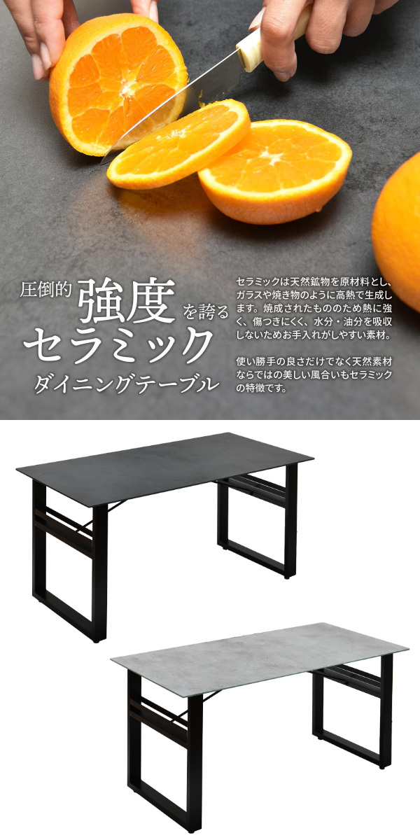ダイニングテーブルとしてはもちろん、書き物やパソコン作業のデスクとしても使いやすく、趣味やDIYの作業台としても活躍します。強度・耐熱性・防水性に優れたセラミック天板で、アイロン掛けにも使えます。