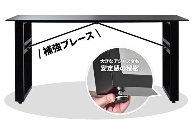 脚部から天板中央に向かって斜めに配置した補強ブレースが、横揺れやがたつきを防ぎ安定感を高めます。座ったときにも邪魔になりにくい位置に設計され、デザイン性も損ないません。