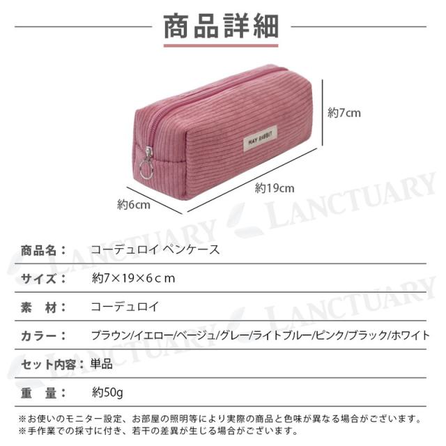 | 主な仕様 | 商品名:コーデュロイ ペンケース サイズ:約7×19×6cm 素材:コーデュロイ カラー:ブラウン、イエロー、ベージュ、グレー、ライトブルー、ピンク、ブラック、ホワイト セット内容:単品 重量:約50g |