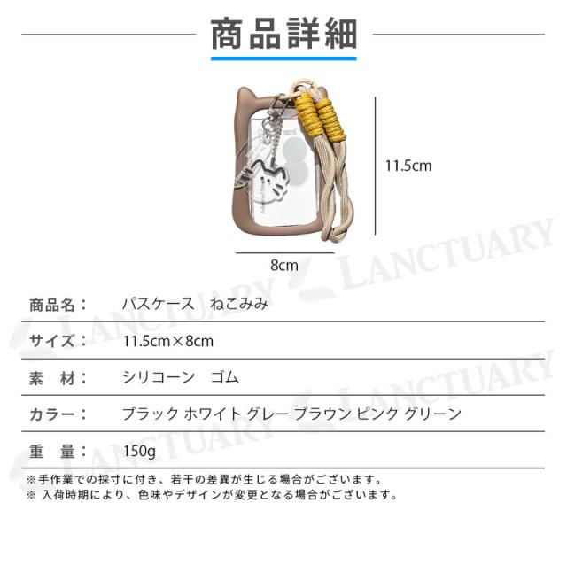 | 主な仕様 | 商品名:パスケース ねこみみ 猫耳 素材:シリコーン ゴム サイズ:横8cm×縦11.5cm 重さ:150g カラー:ブラック グレー ホワイト グリーン ブラウン ピンク |