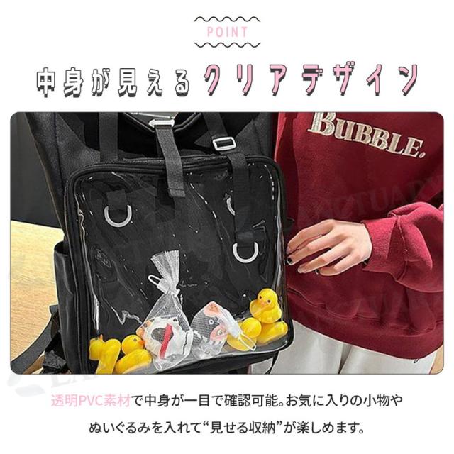お気に入りのグッズを飾れる、2WAYタイプの痛リュックです。 前面のクリアポケットは透明素材を採用しました。 中身がはっきり見えるので、自分だけのデコレーションを存分に楽しめます。