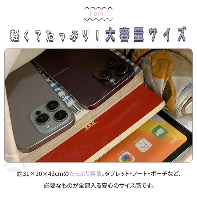 見た目以上の収納力も自慢です。 A4書類やタブレット、ポーチも余裕で収まります。 荷物が全部まとまるので、お出かけがとても身軽になります。