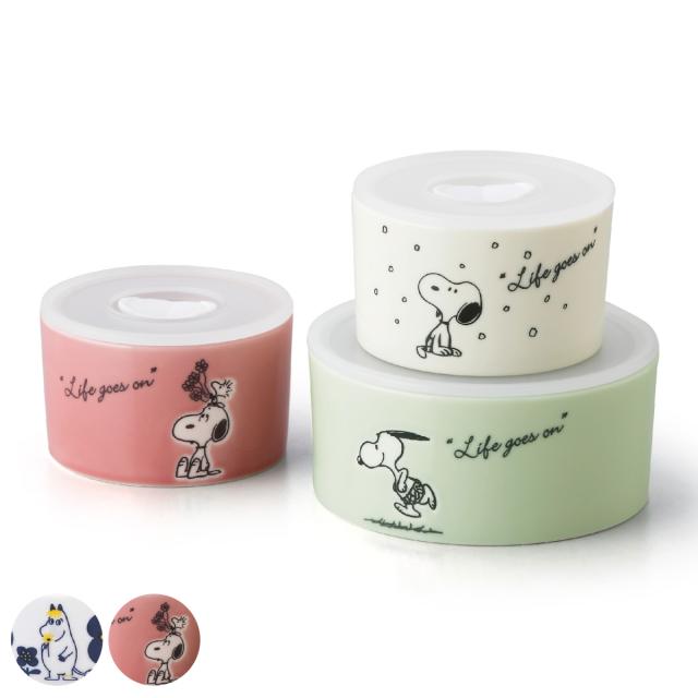 保存容器 ムーミン スヌーピー レンジ 3点セット ( 磁器 密閉 電子レンジ対応 食洗機対応 保存 容器 食品保存 作り置き 日本製 蓋付き キャラクター おしゃれ かわいい シンプル 冷蔵庫 食器 北欧 皿 器 スタッキング )