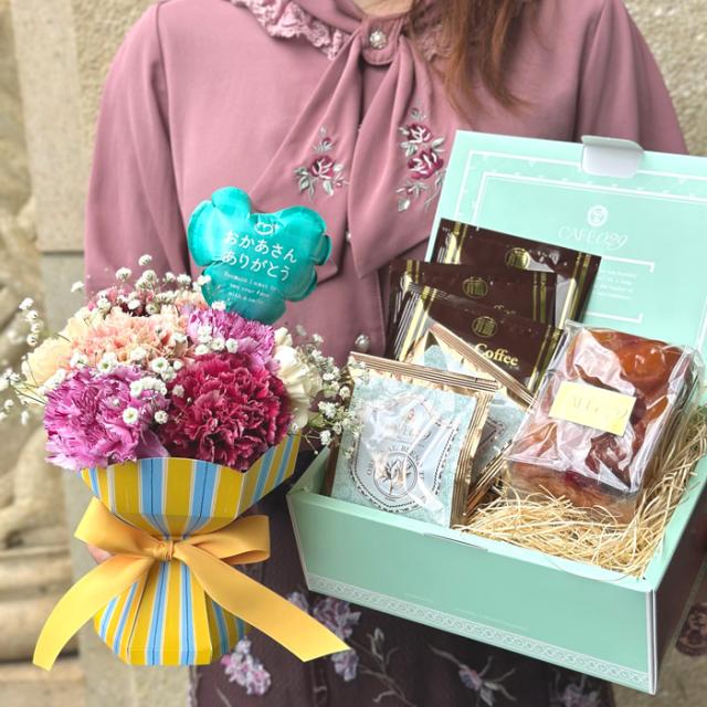 ドリップ珈琲、オリジナルブレンドティー 、苺とフルーツのパウンドケーキとスタンディングブーケをセットにしました。