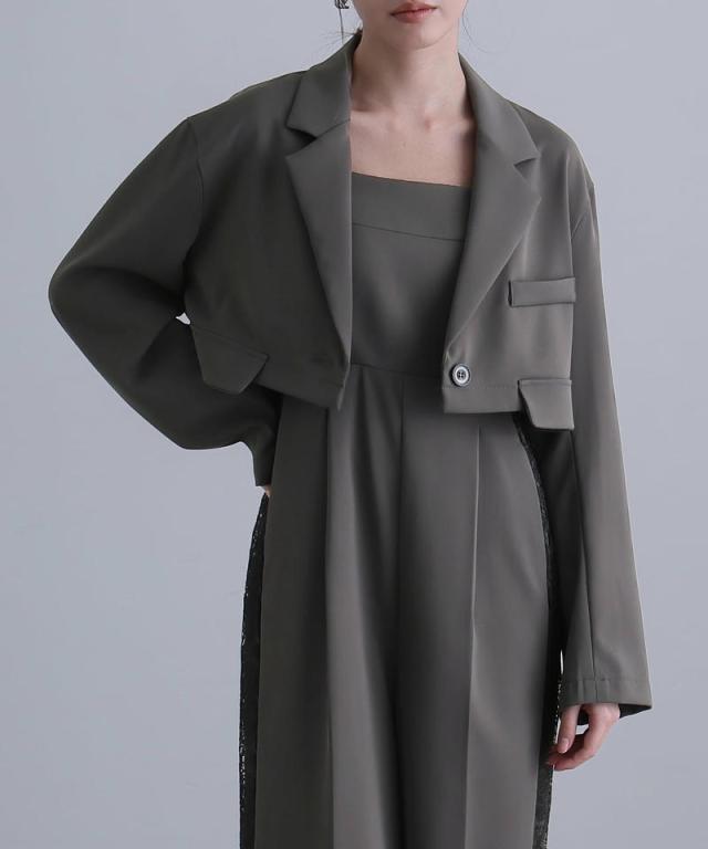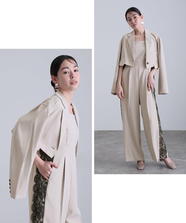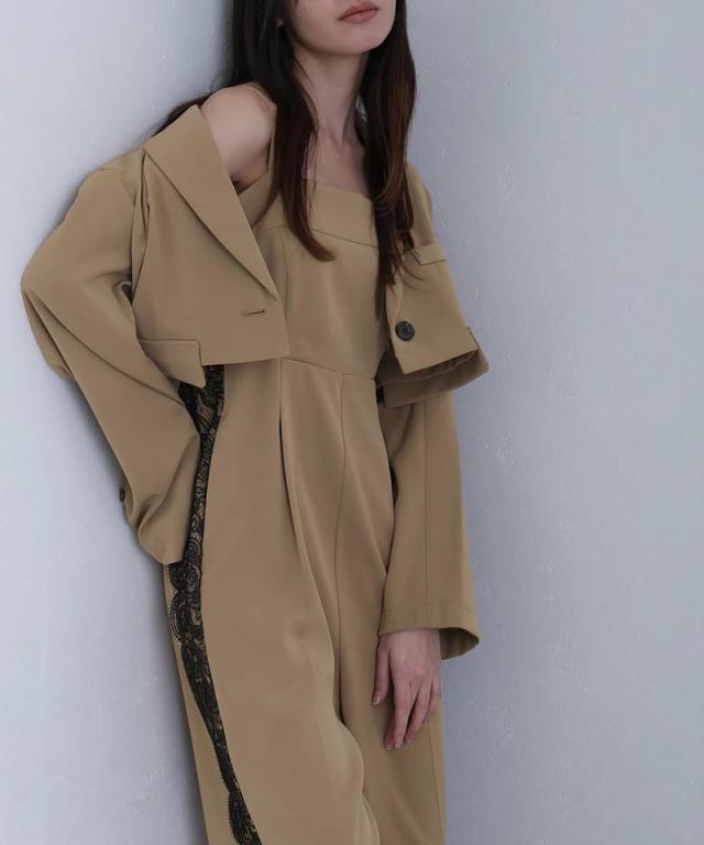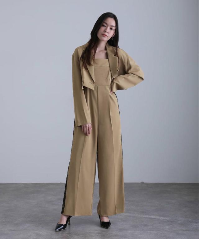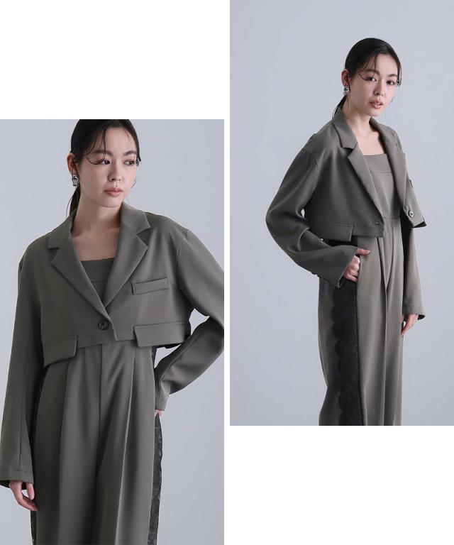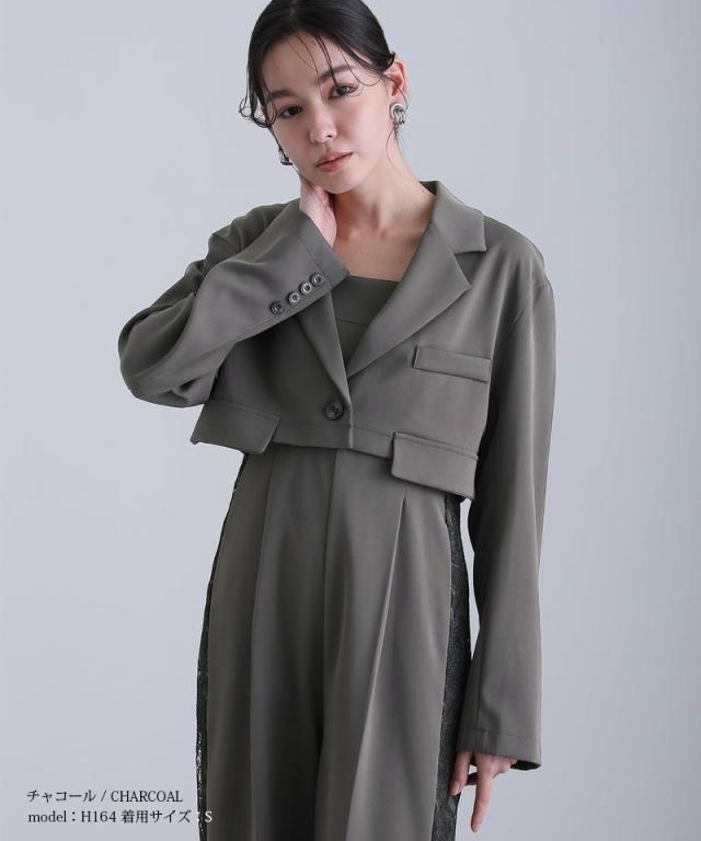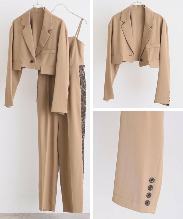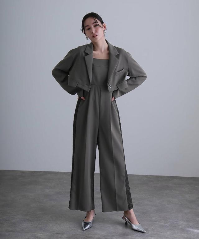 モードなジャケットとキャミオールインワンのセットドレス。