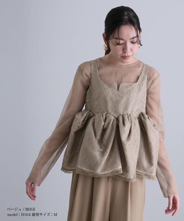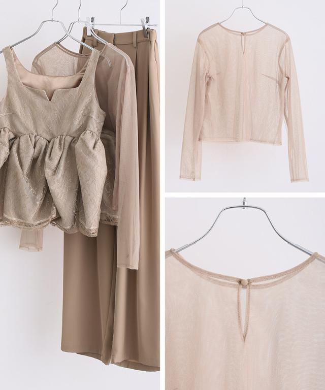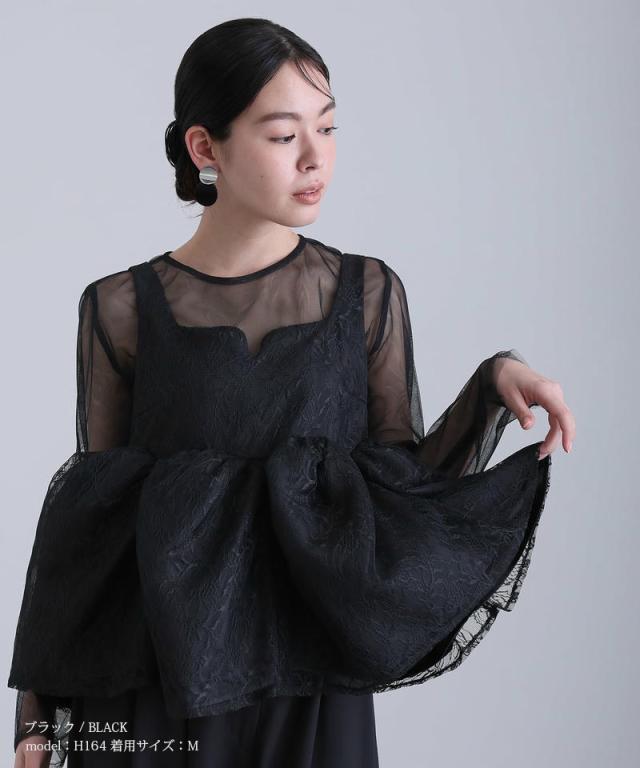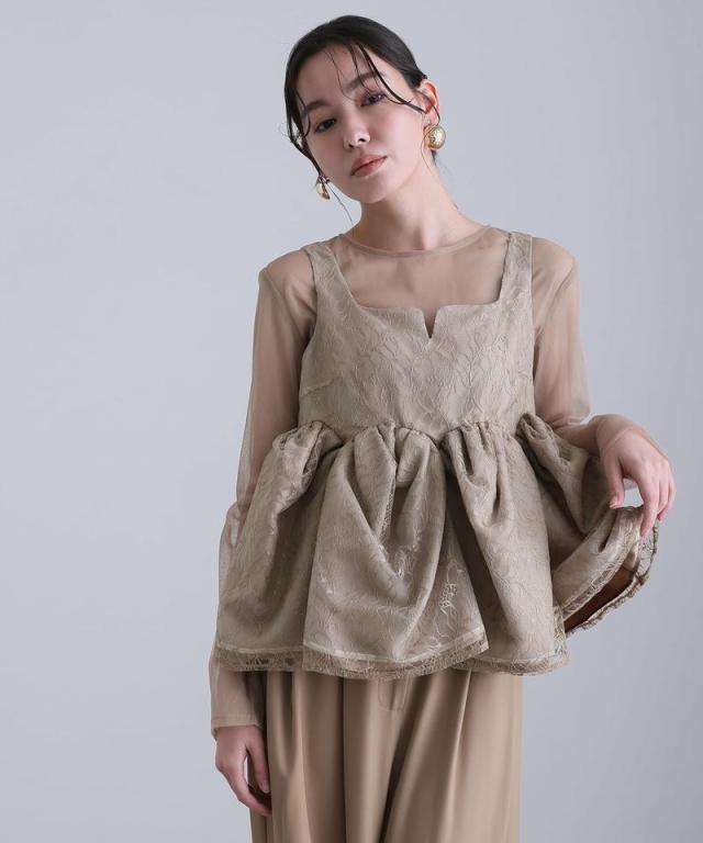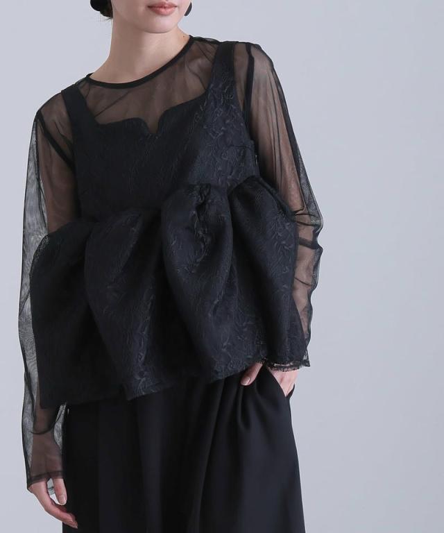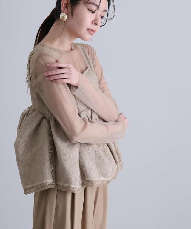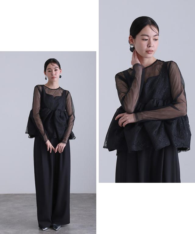 透け感と立体的なシルエットが印象的な、レイヤードスタイルの一着。