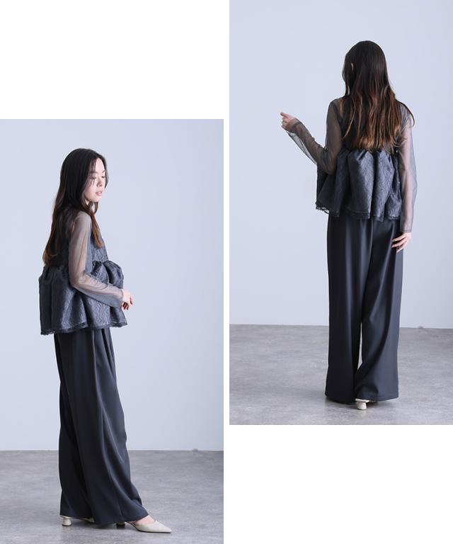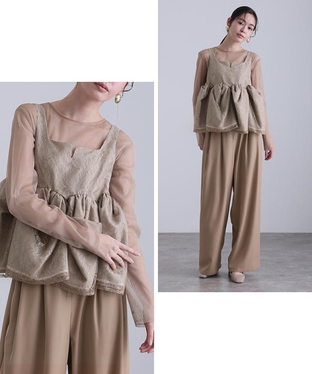 レースビスチェとシアートップス、ワイドパンツを重ねることで奥行きのある表情を演出します。