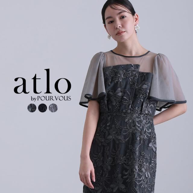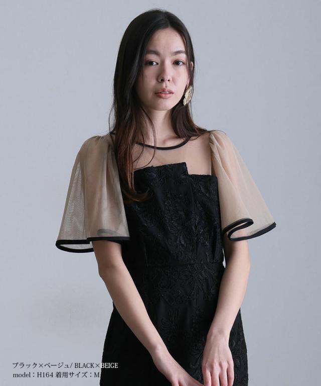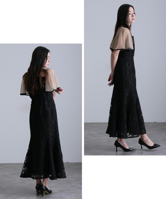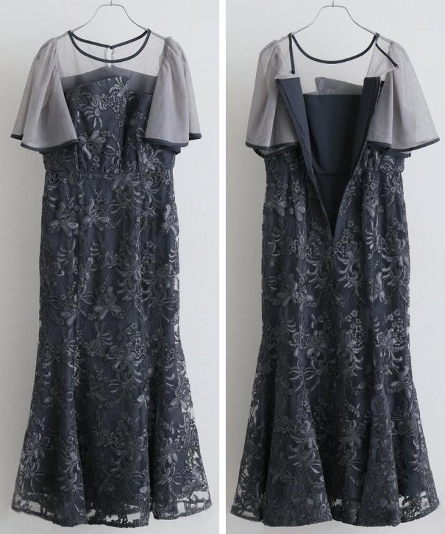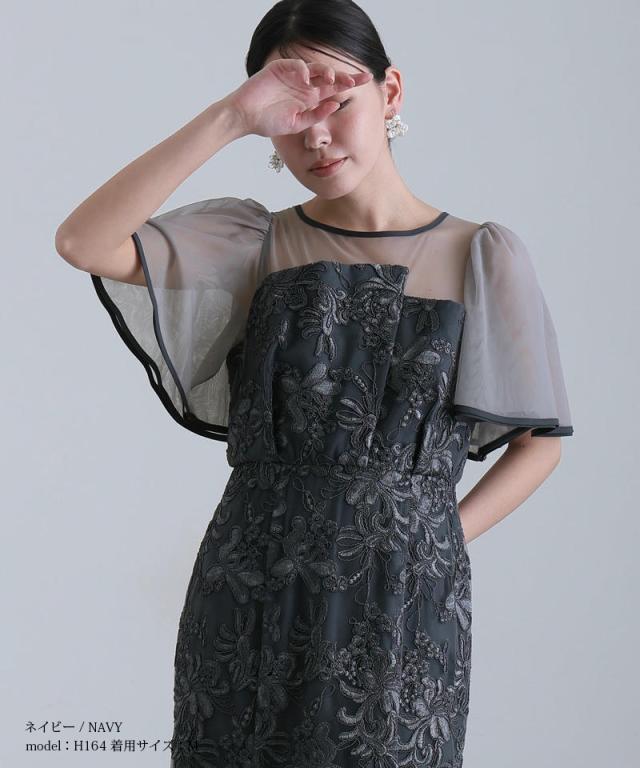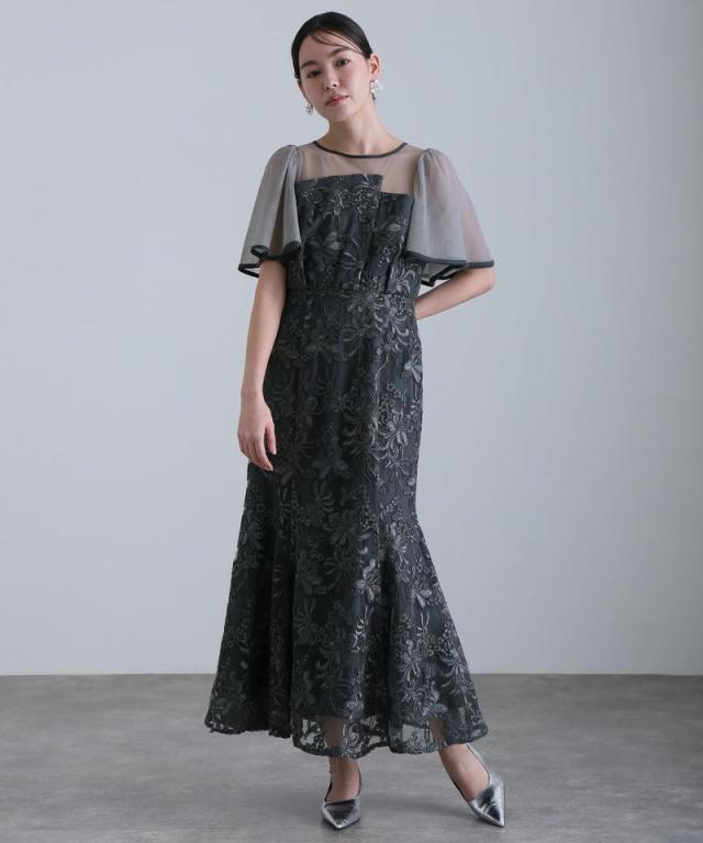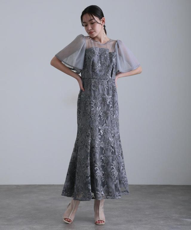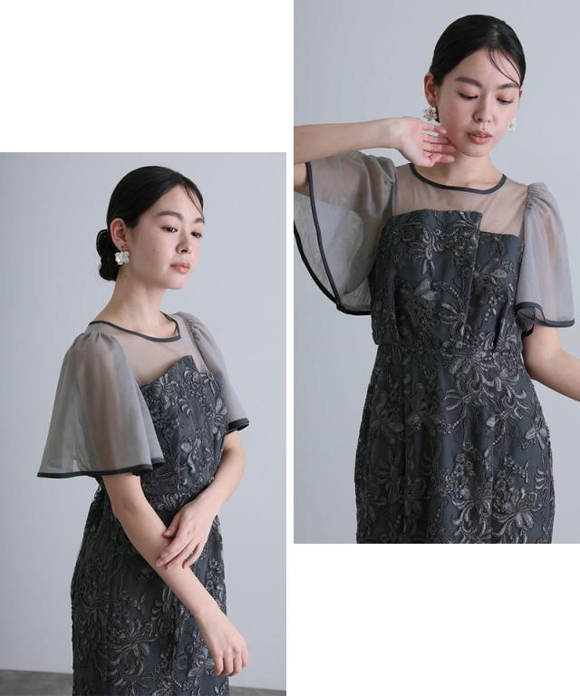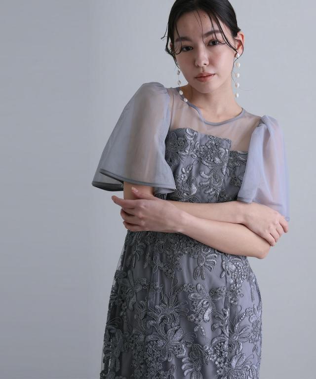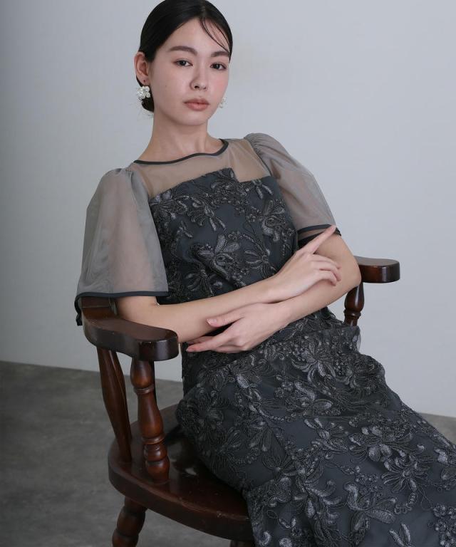繊細な刺繍レースとシアー素材を組み合わせた、気品漂うパーティードレス。