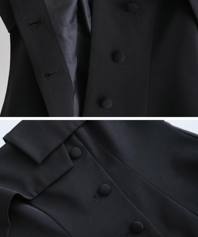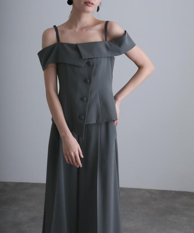 デコルテを美しく見せるオフショル風デザインが印象的なパンツドレス。