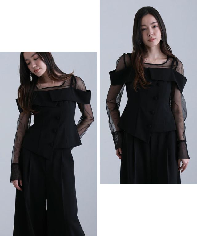 レイヤード風の切替が視線を上に集め、バランスよく着こなせます。