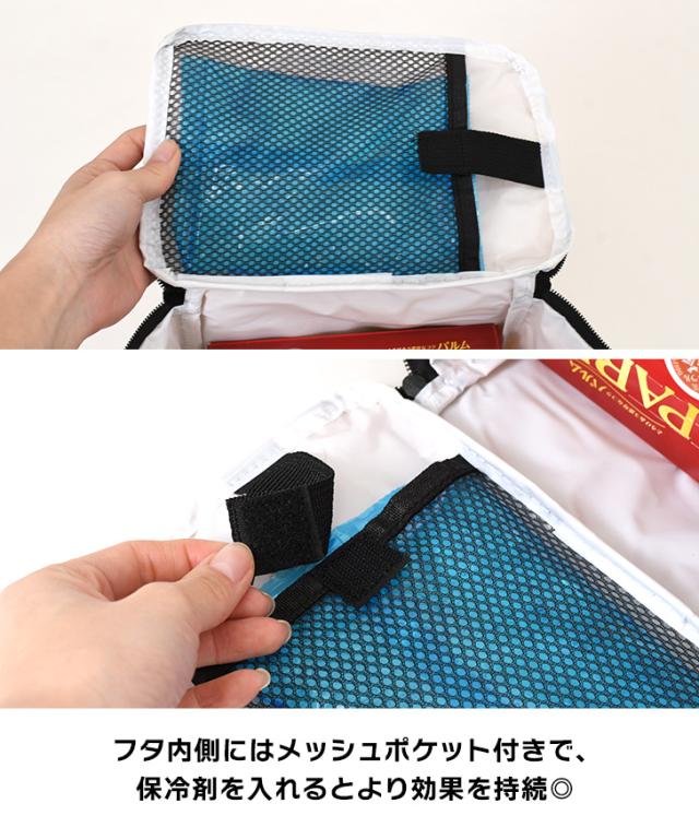 フタ内側にはメッシュポケット付きで、保冷剤を入れるとより効果を持続◎