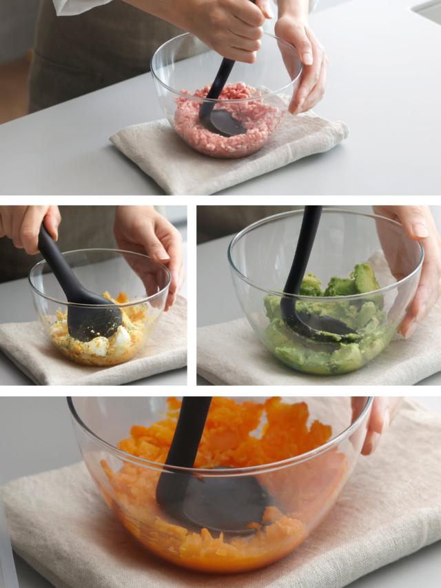 スプーンの先端で食材をざっくり割ってからマッシュできます。あらかじめ崩しておくことで、力のいるつぶし作業をぐっと軽減できます。