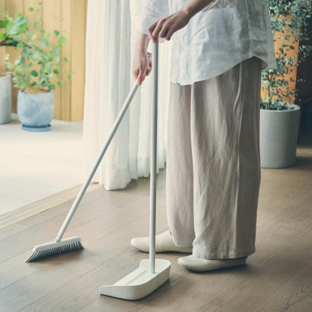 柄が長く設計されているので、腰や背中に負担をかけず、らくな姿勢で掃除できます。ほうきとちりとりを合わせても約510gの軽量設計で、ちりとりを持ちながらの掃除や移動もスムーズ。毎日のちょっとした掃除も軽やかにこなせます。