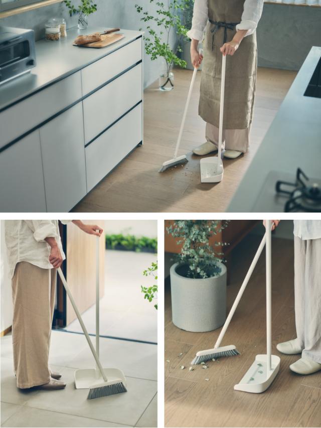 ちりとりの柄の先端にほうきを置くだけで、簡単にピタッと固定できます。手に取るのも戻すのもスムーズで、気づいたときにサッと掃除できる使いやすさが特長です。