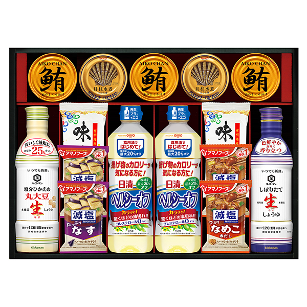 ●キッコーマン塩分ひかえめ丸大豆生しょうゆ450ml、キッコーマンしぼりたて生しょうゆ450ml、日清ヘルシーオフ600g×2、アマノフーズ減塩いつものおみそ汁なす9.0g×2、アマノフーズ減塩いつものおみそ汁なめこ8.0g×2、有明海産味のり(8切5枚)×2、まぐろ油漬け70g×3、宝幸貝柱水煮ほぐし身65g(固形量35g)×2
