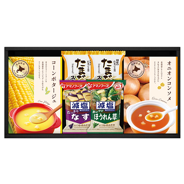●オニオンコンソメ(7g×3袋)、コーンポタージュ(15g×3袋)、たまごスープ6.4g×2、アマノフーズ減塩いつものおみそ汁(なす9.0g、ほうれん草6.8g)
