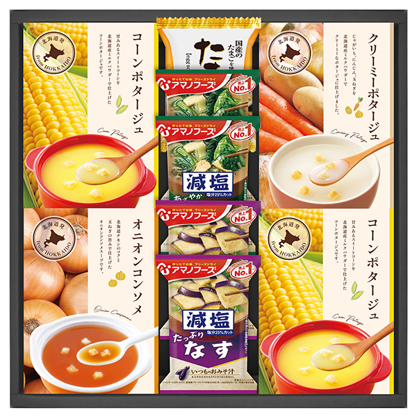 ●コーンポタージュ(15g×3袋)×2、オニオンコンソメ(7g×3袋)、クリーミーポタージュ(15g×3袋)、たまごスープ6.4g、アマノフーズ減塩いつものおみそ汁(なす9.0g、ほうれん草6.8g)×各2