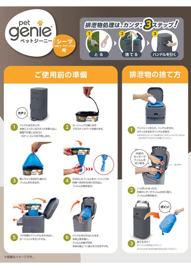 「ペットジーニー」は、ペット用シーツやおむつ、マナーパッドを清潔に処理できる防臭ダストBOXです。