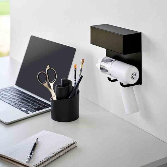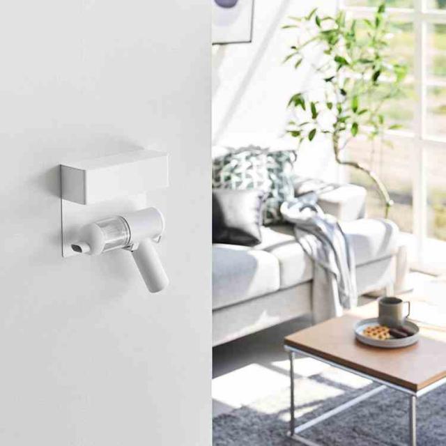 石こうボードピンで簡単に取り付けできる、ミニ掃除機用の壁付けホルダーです。ミニ掃除機本体と付属パーツを一括で収納できます。