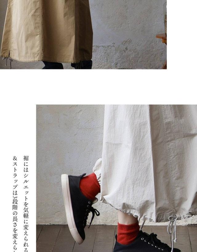 ・裾にはシルエットを気軽に変えられる紐付き&ストラップは3段階の長さを変えられる調整ボタン付き。