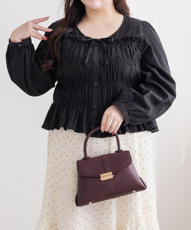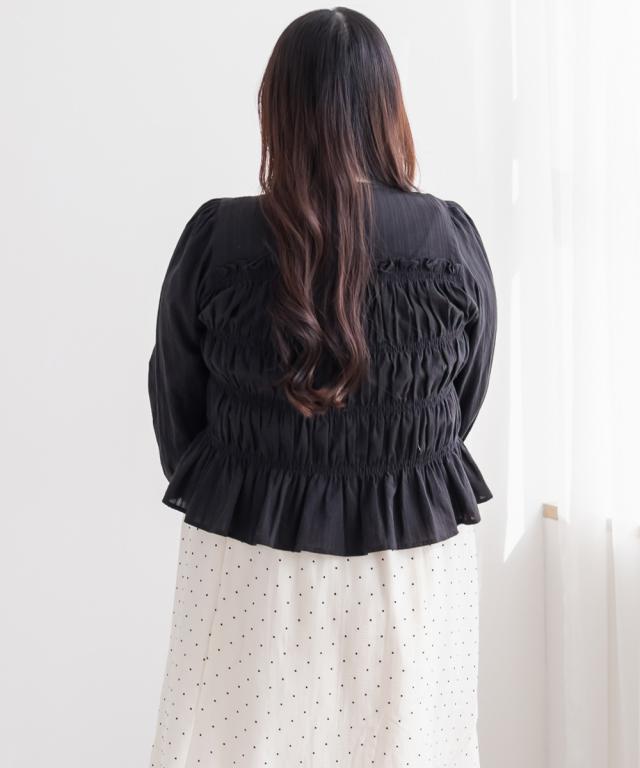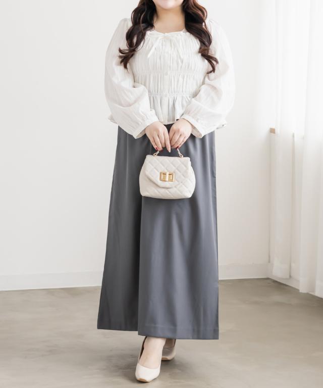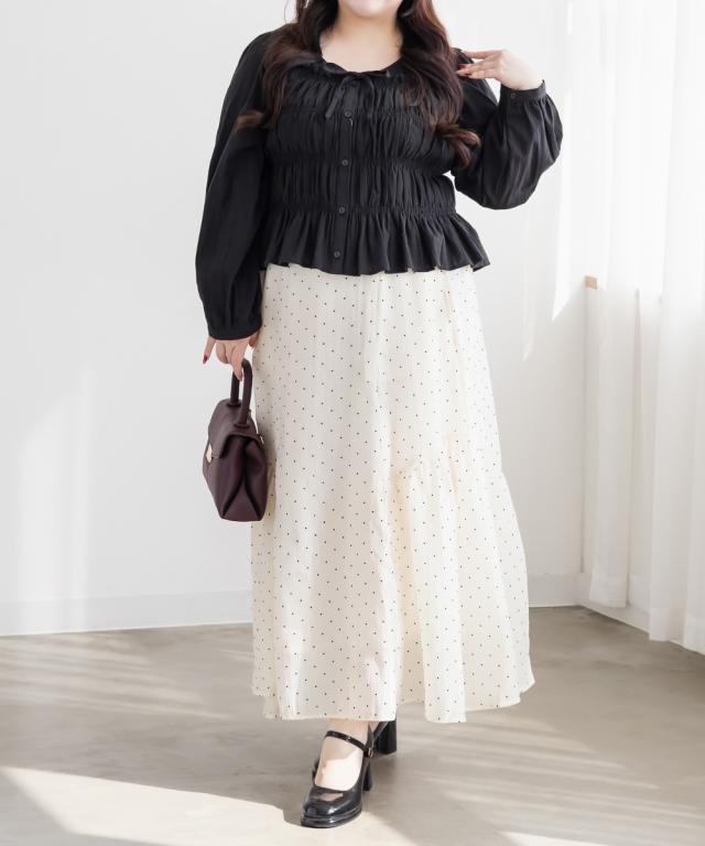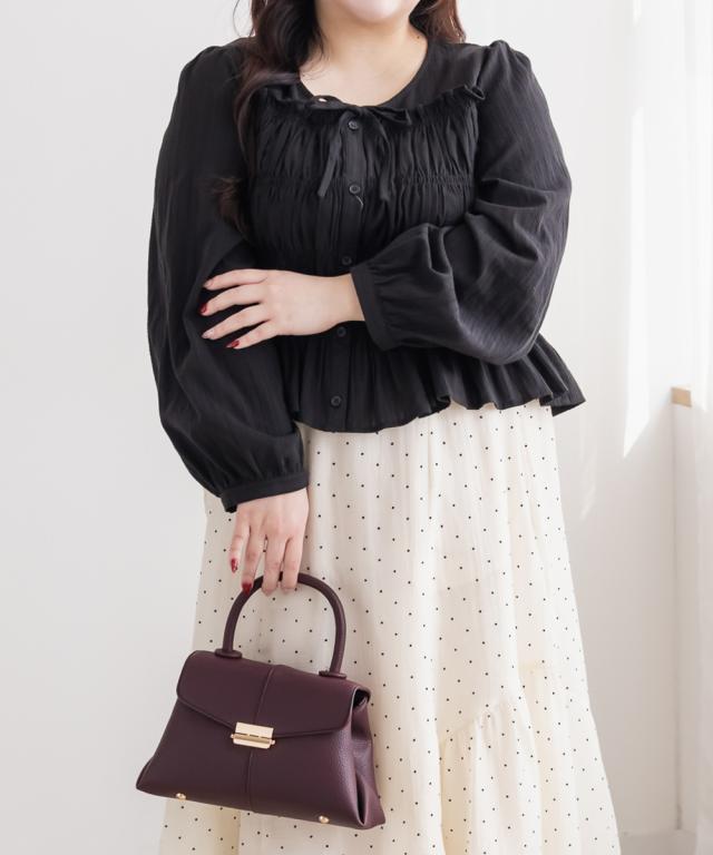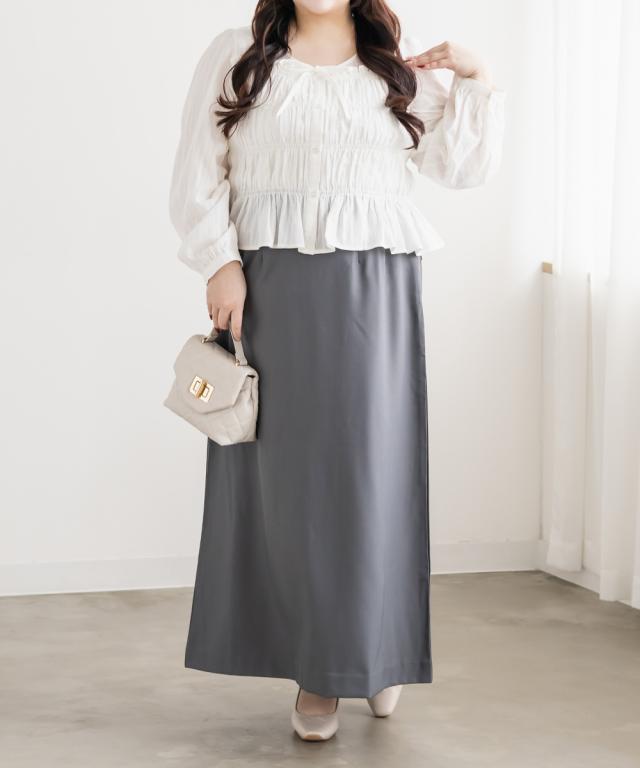 | 3Lを着て着用感はちょうどよく、シャーリング部分も締め付け感なく楽に着られました。バストまわりからウエストにかけてほどよくフィットしてくれるので、自然にメリハリが出て着やせして見えるのが嬉しいポイントです!フロントのリボンが目線を上に集めてくれて、顔まわりも華やかな印象になります◎ ふんわり広がるシルエットでお腹まわりや腰まわりもカバーできました。 スカートにもパンツにも合わせやすく、1枚で女性らしいスタイリングが完成するブラウスだと思います! |