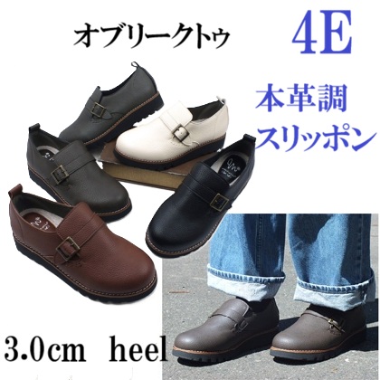 カジュアルシューズ レディース スリッポン オブリークトゥ 4E 幅広 本革外反母趾 本革調シボPU コンフォート 軽量 防滑 履きやすい 歩きやすい 痛くない カジュアル レディースパンプス