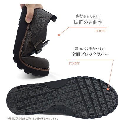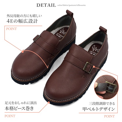 4Eの幅広設計オブリークトゥで足入れゆったり快適な履き心地。