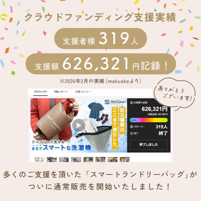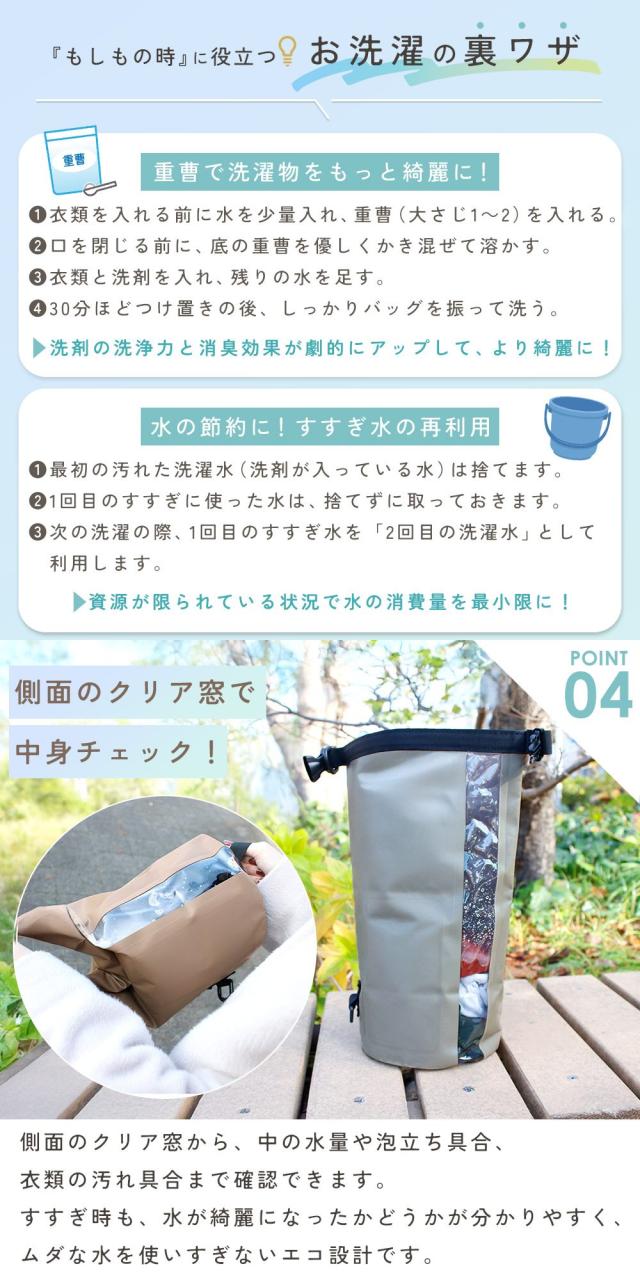 防災の観点でも、洗濯袋・防水バッグはあると安心。断水時の予洗いや、汚れ物を分けて保管したいときにも役立ちます。旅行・アウトドア・防災まで、日常と非常時のどちらにもフィットするスマートランドリーバッグで、洗濯をもっと身近で快適なものに。