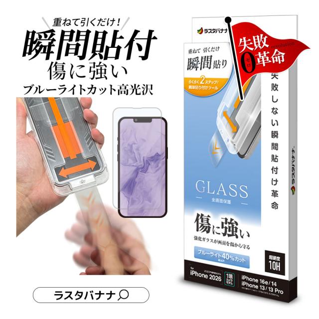【送料無料】iPhone 17e iPhone 16e 14 13 Pro 13 ガラスフィルム 全面保護 ブルーライトカット 高光沢 クリア 貼付革命 瞬間貼り 失敗しない瞬間簡単貼り付け レボリューション 0.33mm 硬度10H アイフォン 保護フィルム MTK5294IP6E ラスタバナナ