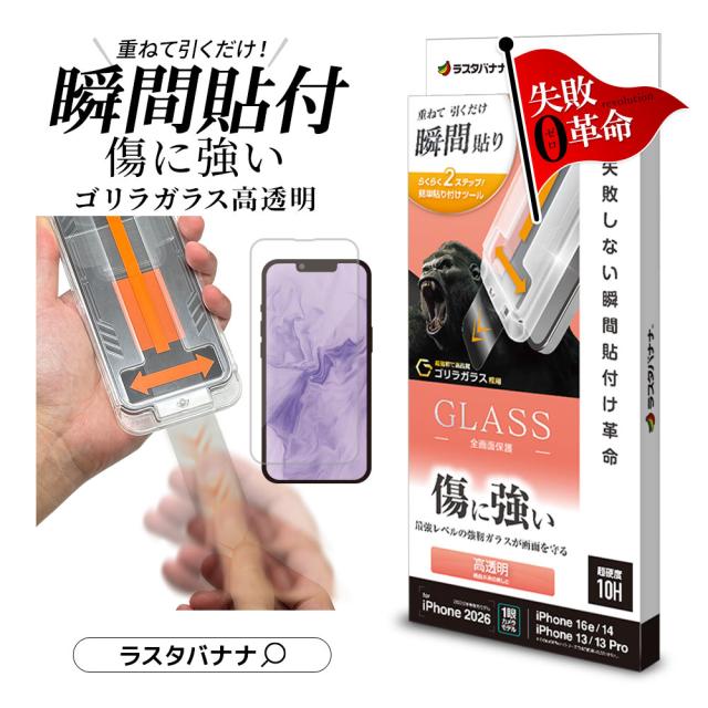 iPhone 17e iPhone 16e 14 13 Pro 13 ガラスフィルム 全面保護 高光沢 高透明 クリア ゴリラガラス採用 0.33mm 硬度10H 貼付革命 瞬間貼り 失敗しない瞬間簡単貼り付け レボリューション アイフォン 保護フィルム MTK5297IP6E ラスタバナナ