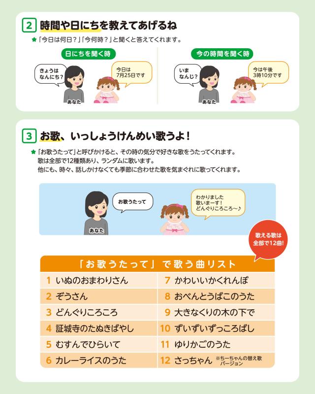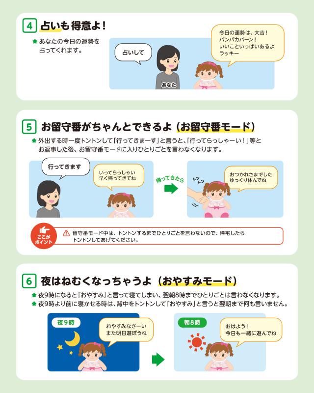 | 機能 | 目覚まし・歌・占い・お留守番モード・おやすみモード |