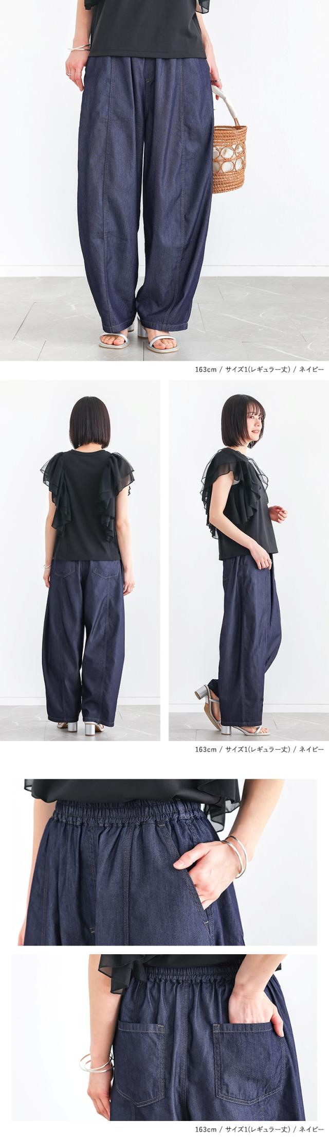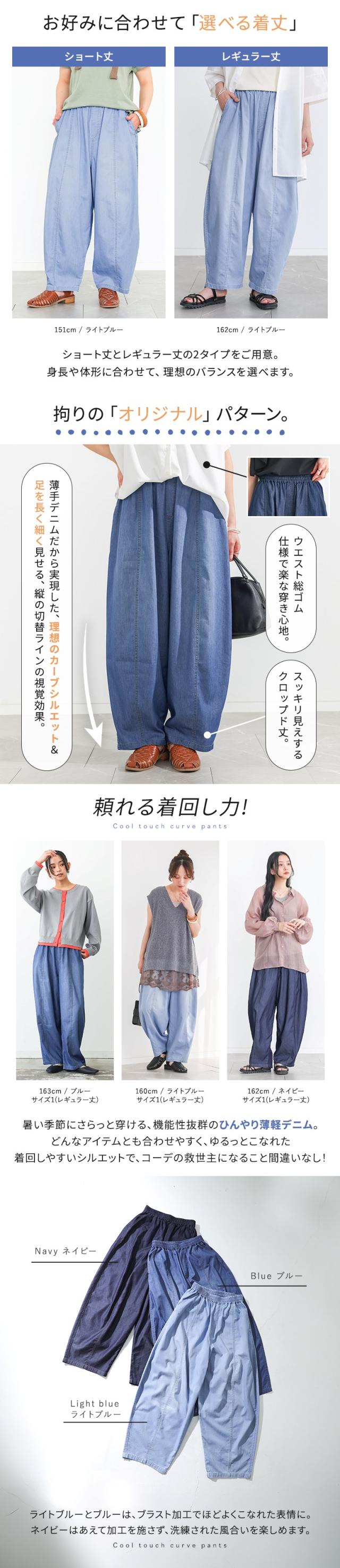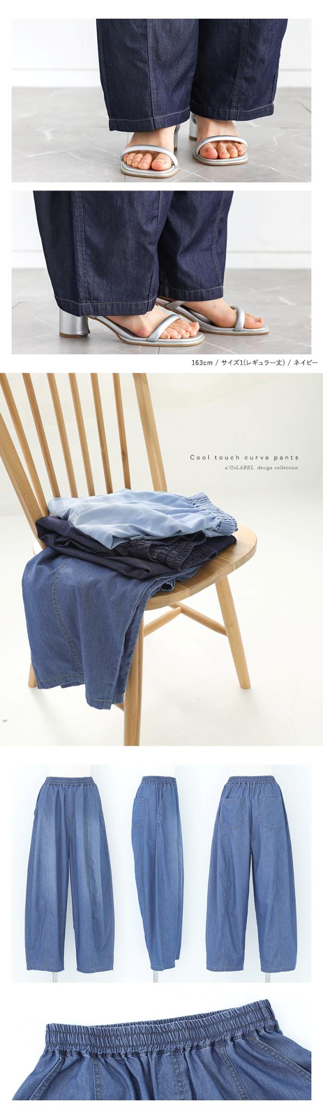 <春新作>『選べる着丈カーブデニムパンツ』【メール便不可】【20】[デニムパンツ 接触冷感 レディース ボトムス ロング デニム バルーンパンツ 吸水速乾 UVカット ウエストゴム 体型カバー 春 夏]