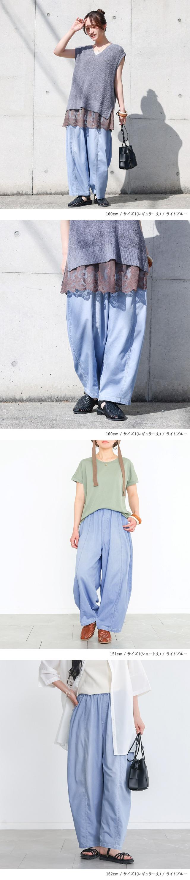 | staff:P/161cm B98 W82 H99 【普段着用】 Tops: LL Bottoms:LL | 【1(ショート丈)】 着丈(ウエスト穿き):くるぶしが見える位 【1(レギュラー丈)】 着丈(ウエスト穿き):かかとが隠れる位 太ももはゆったり、他はちょうどいいフィット感で着用できました。 【2(ショート丈)】 着丈(ウエスト穿き):くるぶしが隠れる位 【2(レギュラー丈)】 着丈(ウエスト穿き):かかとが隠れる位 ボリュームが出すぎず、全体的にすっきりしたシルエットで穿けました。丈感を身長に合わせて選べるので、裾を引きずる心配がなくバランスよく着用できました。レギュラー丈はよりゆったりした着用感です。ウエストは締め付け感がなくラクな穿き心地でした。 私の場合は、2(ショート丈)を選びます。 |