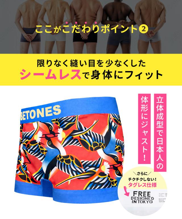 恐れず飛べ。枠を越え。BETONES(ビトーンズ)のメンズボクサーパンツ。昨日の自分を追い越せ。CRANE BLOOMは挑戦する者のための翼。Sサイズの方からLサイズの方までしっかりフィット&縫い目を限りなくなくした成型3Dボディがやみつきに!タグレスなのでストレスフリーな穿き心地。