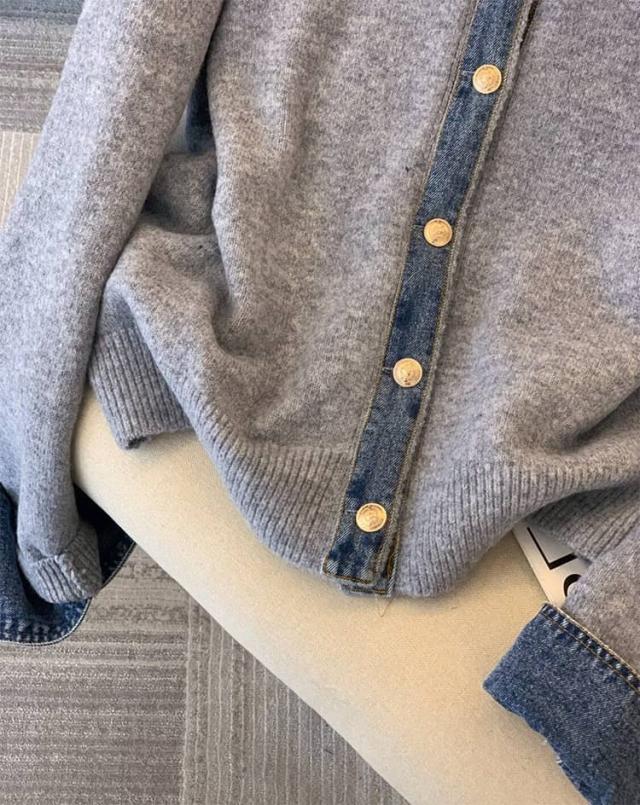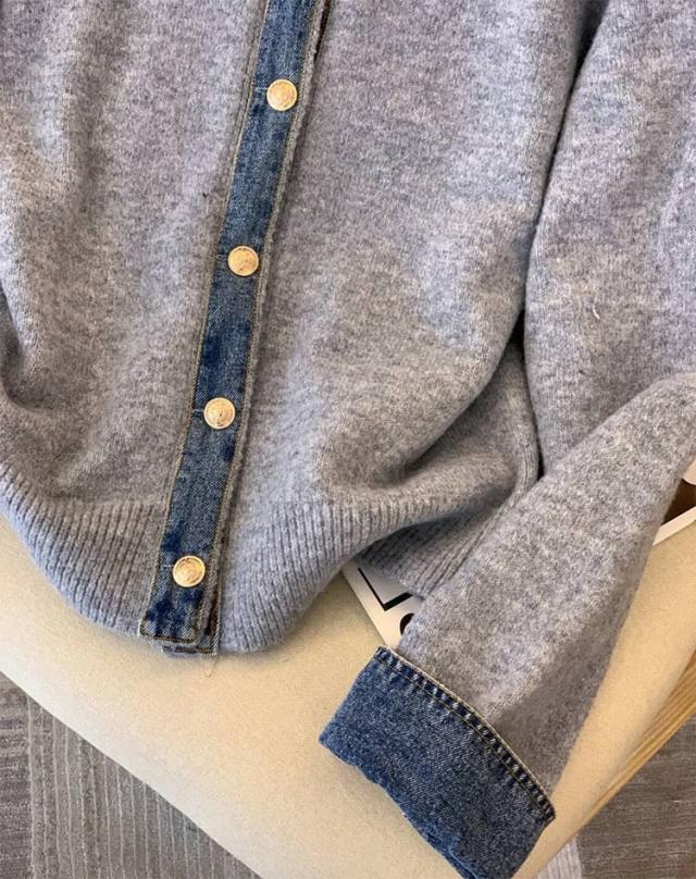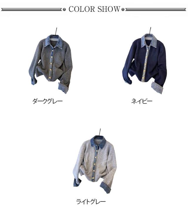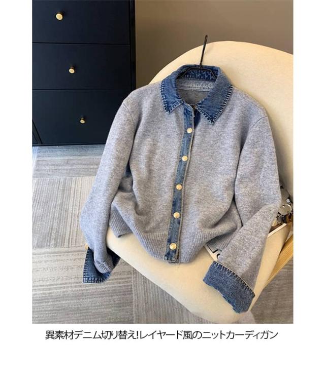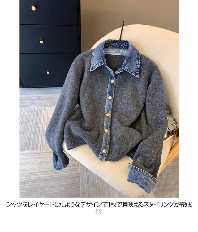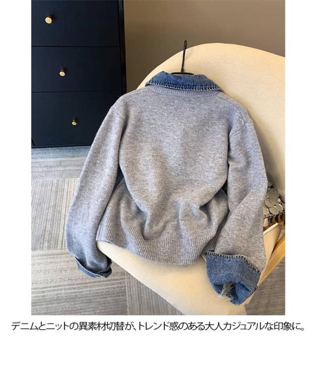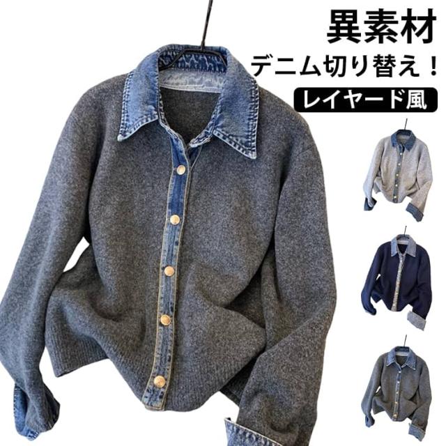 カーディガン レディース ニット デニム レイヤード風 カジュアル 重ね着風 おしゃれ カジュアル ドッキング 大人可愛い 長袖 襟付き 大きいサイズ ジャケット ゆったり 大人 女性 トップス フェイクレイヤード 重ね着 春秋冬 通勤