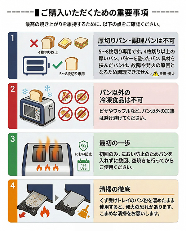 ■ 共通仕様・注意事項 * セット内容:本体、取扱説明書(保証書付) * 保証期間:1年間 * コードの長さ:約 85cm * 初回使用時は必ず空焼きを行ってください * 使用後は必ずくず受けトレイのパン粉を捨ててください * 本体が冷める前にお手入れを行わないでください * 電源プラグは使用後に必ず抜いてください ━━━━━━━━━━━━━━━━ ■ 窓があるから、忙しい朝も一度で決まる安心感 ━━━━━━━━━━━━━━━━ パンを焦がして廃棄する損失や、焼き直しのタイムロス。 これらは朝の貴重な時間を奪う小さなストレスです。 窓付きの設計は、その失敗を物理的に防ぐための合理的な答え。 1日あたりわずか数円の投資で、理想の焼き色と 確実な安心感が手に入ります。 失敗のない快適な朝食を、ここから始めませんか? |
