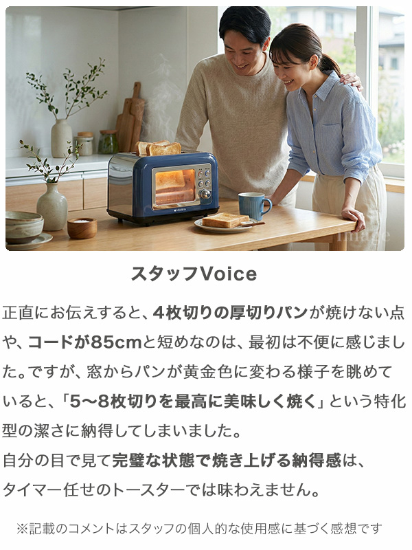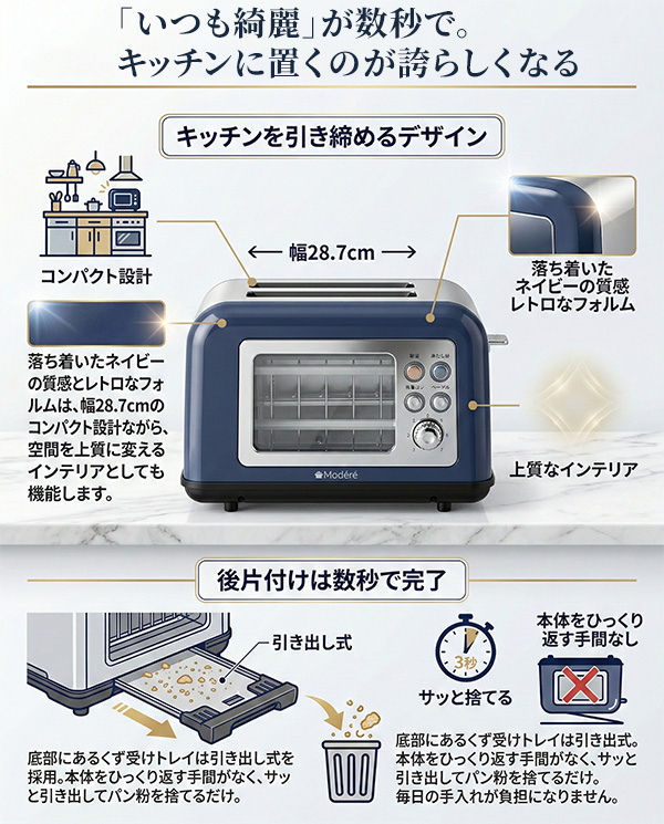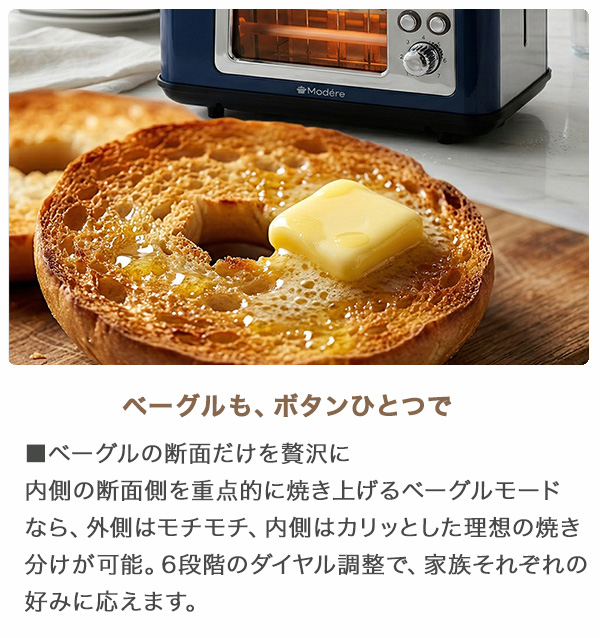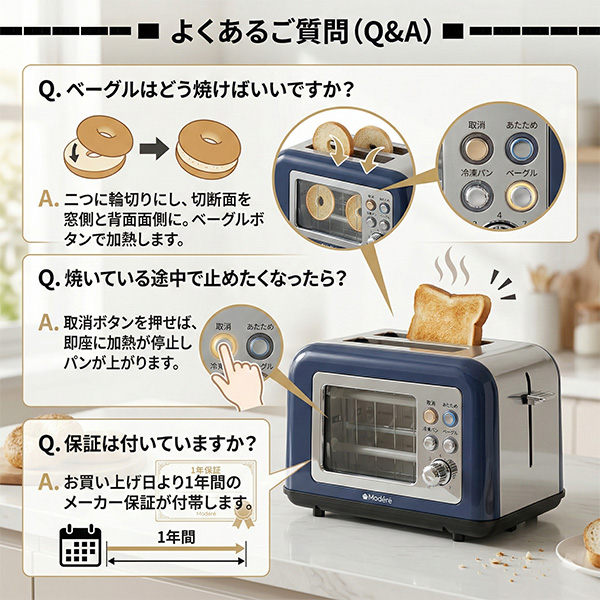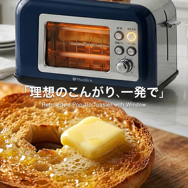 焼き色が見える。もう焦がさない。理想のトーストを窓から見守る。 レトロ調窓付きポップアップトースター Modere HRS-2062 ネイビー ━━━━━━━━━━━━━━━━ ■ 焼き加減を「目」で管理する安心設計 ━━━━━━━━━━━━━━━━ トーストがキツネ色に変わる最高の瞬間を、 前面の耐熱ガラス窓から直接確認できます。 タイマー任せにして焦がしてしまう不安を解消し、 自分の目で見てベストなタイミングで焼き上げる。 中が見えないストレスを物理的に取り除き、 確実な仕上がりを実現するトースターです。 ━━━━━━━━━━━━━━━━ ■ 冷凍パンもベーグルも、ボタンひとつで ━━━━━━━━━━━━━━━━ 冷凍パンも外カリ中フワに: 解凍から焼き上げまでを一気に行う専用モードを搭載。 霜の降りた食パンも、中まで熱々に仕上げます。 慌ただしい平日でも、焼き立ての質感が手に入ります。 ベーグルの断面だけを贅沢に: 内側の断面側を重点的に焼き上げるベーグルモードなら、 外側はモチモチ、内側はカリッとした理想の焼き分けが可能。 6段階のダイヤル調整で、家族それぞれの好みに応えます。 ━━━━━━━━━━━━━━━━ ■ 日々の使い勝手を高める合理的な工夫 ━━━━━━━━━━━━━━━━ 後片付けは数秒で完了: 底部にあるくず受けトレイは引き出し式を採用。 本体をひっくり返す手間がなく、サッと引き出して パン粉を捨てるだけ。毎日の手入れが負担になりません。 キッチンを引き締めるデザイン: 落ち着いたネイビーの質感とレトロなフォルムは、 幅28.7cmのコンパクト設計ながら、 空間を上質に変えるインテリアとしても機能します。 ━━━━━━━━━━━━━━━━ ■ スタッフVoice ━━━━━━━━━━━━━━━━ 正直にお伝えすると、4枚切りの厚切りパンが焼けない点や、 コードが85cmと短めなのは、最初は不便に感じました。 ですが、窓からパンが黄金色に変わる様子を眺めていると、 「5〜8枚切りを最高に美味しく焼く」という特化型の 潔さに納得してしまいました。 自分の目で見て完璧な状態で焼き上げる納得感は、 タイマー任せのトースターでは味わえません。 万能ではありませんが、理想の焼き色にこだわりたい方には これ以上ないほど誠実な相棒になってくれます。 ━━━━━━━━━━━━━━━━ ■ ご購入いただくための重要事項 ━━━━━━━━━━━━━━━━ 最高の焼き上がりを維持するために、以下の点をご確認ください。 ・厚切りパン・調理パンは不可: 5〜8枚切り専用です。4枚切り以上の厚いパン、 バターを塗ったパン、具材を挟んだパンは、 故障や発火の原因となるため調理できません。 ・パン以外の冷凍食品は不可: ピザやワッフルなど、パン以外の加熱は避けてください。 ・最初の一歩: 初回のみ、におい防止のためパンを入れずに数回、 空焼きを行ってからご使用ください。 ・清掃の徹底: くず受けトレイのパン粉を溜めたまま使用すると、 発火の恐れがあります。こまめな清掃をお願いします。 ━━━━━━━━━━━━━━━━ ■ よくあるご質問(Q&A) ━━━━━━━━━━━━━━━━ Q. ベーグルはどう焼けばいいですか? A. 二つに輪切りにし、焼きたい断面を窓側と背面側に 向けて投入してください。ベーグルボタンで加熱します。 Q. 焼いている途中で止めたくなったら? A. 取消ボタンを押せば、即座に加熱が停止しパンが上がります。 Q. 保証は付いていますか? A. お買い上げ日より1年間のメーカー保証が付帯します。 ■ 製品スペック一覧
