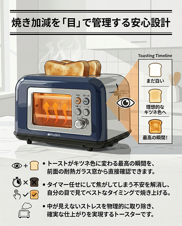 焼き色が見える。もう焦がさない。理想のトーストを窓から見守る。