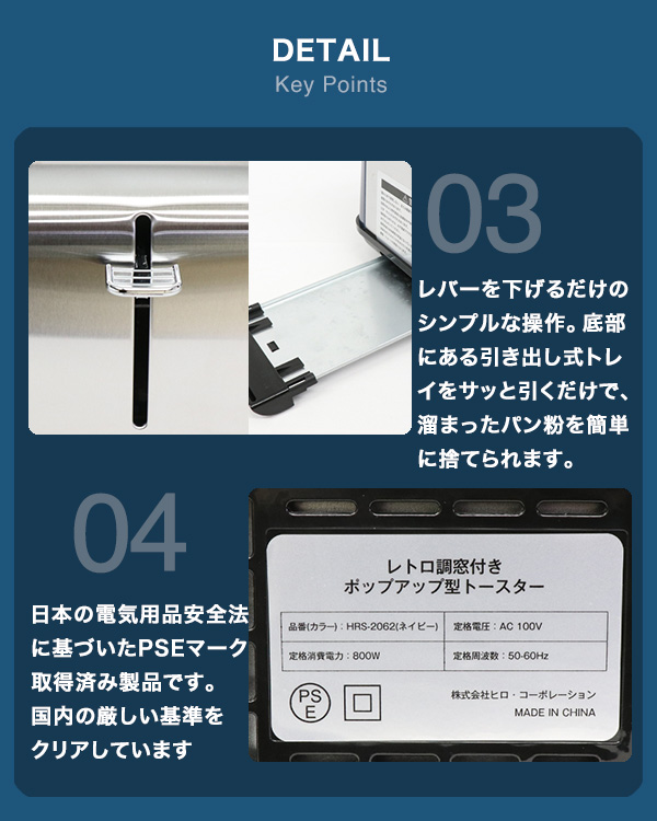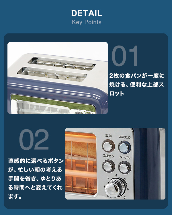レトロ調窓付きポップアップトースター Modere HRS-2062 ネイビー