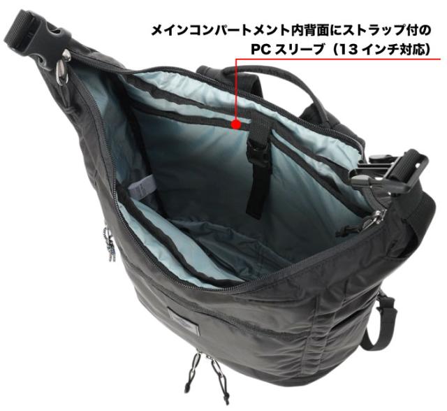 本体背面にはストラップ付きの13インチ対応PCスリーブを搭載。