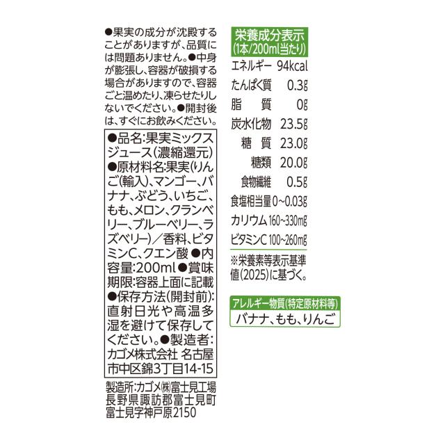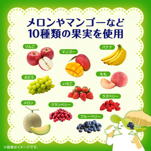 原材料: 果実果実(りんご(輸入)、マンゴー、バナナ、ぶどう、いちご、もも、メロン、クランベリー、ブルーベリー、ラズベリー)/香料、ビタミンC、クエン酸