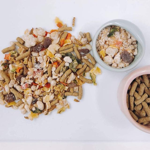 原材料:たんぽぽ、オオバコ、ローズマリー、カモミール、桑の葉、大豆粉、チキン、チーズ、ビール酵母、アルファルファ、ブドウ、りんご、パイナップル、バナナ、パパイヤ、いちご等、オーツ、ライ麦等の穀類、ココナッツ、アーモンド、ニンジン、キャベツ、ひまわり、ミルワーム、アガリクス、卵由来成分、各種ミネラル、各種ビタミンetc.