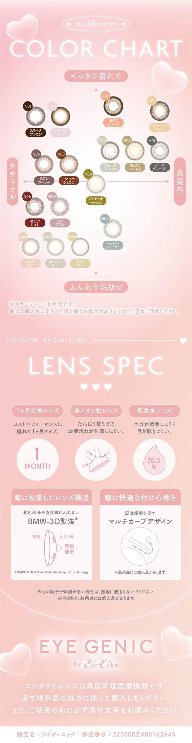 ■レンズ直径(DIA) 14.5mm 着色直径 13.7mm ベースカーブ(BC) 8.7mm 中心厚 0.07mm(-3.00D) ★新色のピュアモア、ムーニーヌード、ディアベイビーを除く18色 ■レンズ直径(DIA) 14.2mm 着色直径 13.4mm ベースカーブ(BC) 8.6mm 中心厚 0.07mm(-3.00D) ★ピュアモア、ムーニーヌード、ディアベイビー(3色)