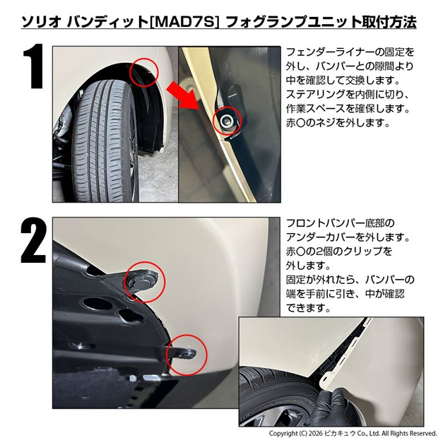 ・フォグランプが装着されていない車両に取り付ける場合は、フォグランプスイッチやハーネスを別途ご用意いただいたり、バンパーの加工が必要になることがあります。