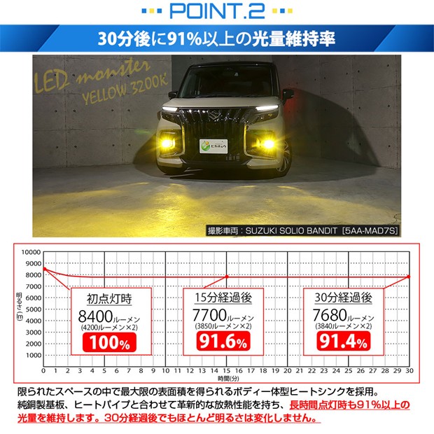 明るさ全光束8400ルーメンの最強のモンスターフォグランプLEDバルブです。放熱性能が高いため、長時間点灯後も91%以上の光量を維持します。30分経過後もほとんど明るさが変化しない放熱対策を施しています。純正球の配光特性に徹底的にこだわり、理想的な配光を実現しています。