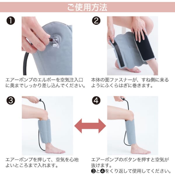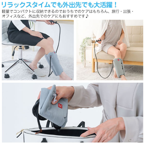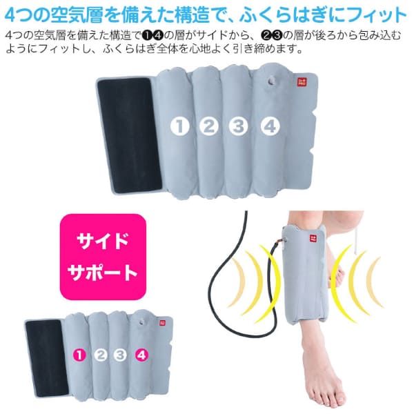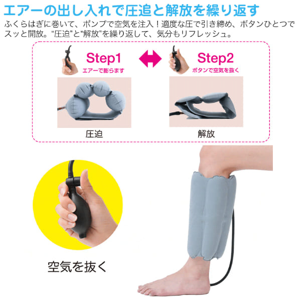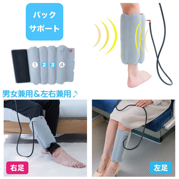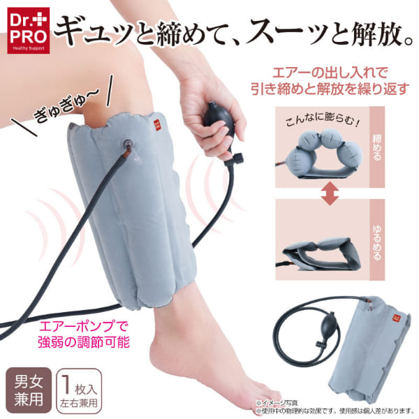 ギュッと締めて、スーッと解放。仕事や家事で日々頑張る脚に、空気圧でご褒美ケア!立ち仕事やたくさん歩いた日に、脚のリラックスタイム。■エアーの出し入れで圧追と解放を繰り返す、やみつきリズム圧ケア。ポンプで空気を注入するだけで、ふくらはぎをギュッと引き締め、ボタンひとつでスッと解放。“締める”と“ゆるめる”を繰り返し、エアーの強弱で重だるい脚もスッキリ!気分までリフレッシュ♪さらに、4つの空気層を備えた構造でサイドから、後ろから包み込むようにフィットし、ふくらはぎ全体を心地よく引き締めます。■使い方簡単!ふくらはぎにサッと巻いて、ポンプで空気を注入し、ボタンを押すだけで簡単に空気が抜けます。面ファスナー仕様で、サイズ調節もラクラク。■リラックスタイムでも外出先でも大活躍!軽量でコンパクトに収納できるのでおうちでのケアはもちろん、旅行・出張・オフィスなど、外出先でのケアにもおすすめです♪■男女兼用&左右兼用♪