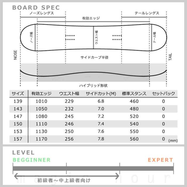ターンの練習もグラトリも思いっきり挑戦したいライダーに、初めてのマイボードおすすめの1本! キャンバーとロッカーを融合させたハイブリッド構造で切り返しもらくらく♪ ツインチップなのでフリーランからグラトリまであらゆる地形で操作性がよく快適に楽しめフェイキーもチャレンジしやすい♪ 形状: ハイブリッドキャンバー/ Wロッカー, ツインチップ, SW構造 |