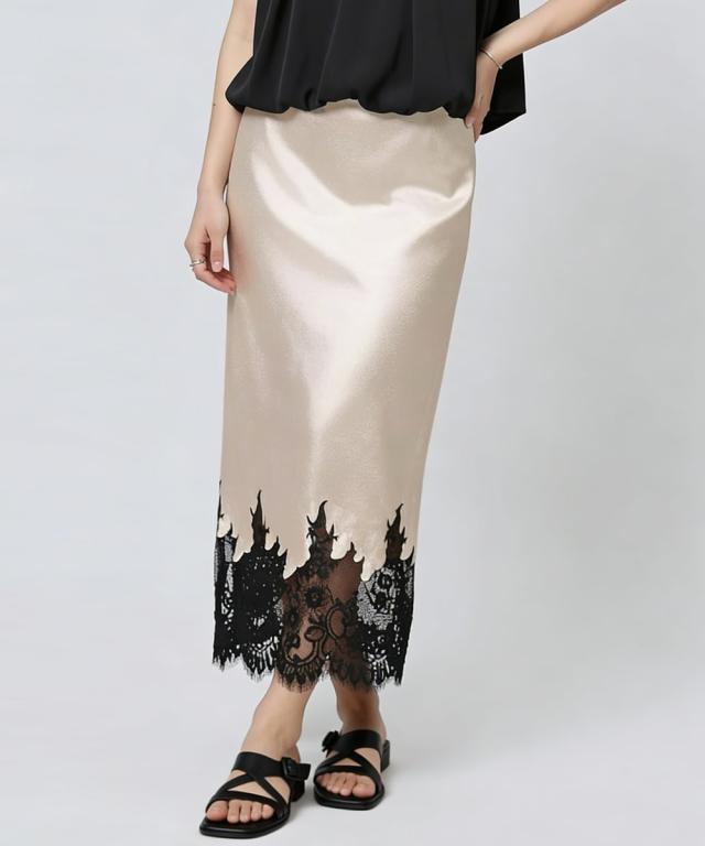 パーティー映えもする裾レースとサテン生地がドッキングしたロングスカート。